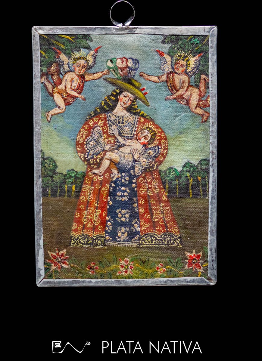 Vestida con un manto rojo muy ornamentado y sosteniendo a un niño. A su alrrededor vuelan varios angelitos con halos dorados y plumas de colores, todo enmarcado por un paisaje y flores decorativas en la parte inferior.
