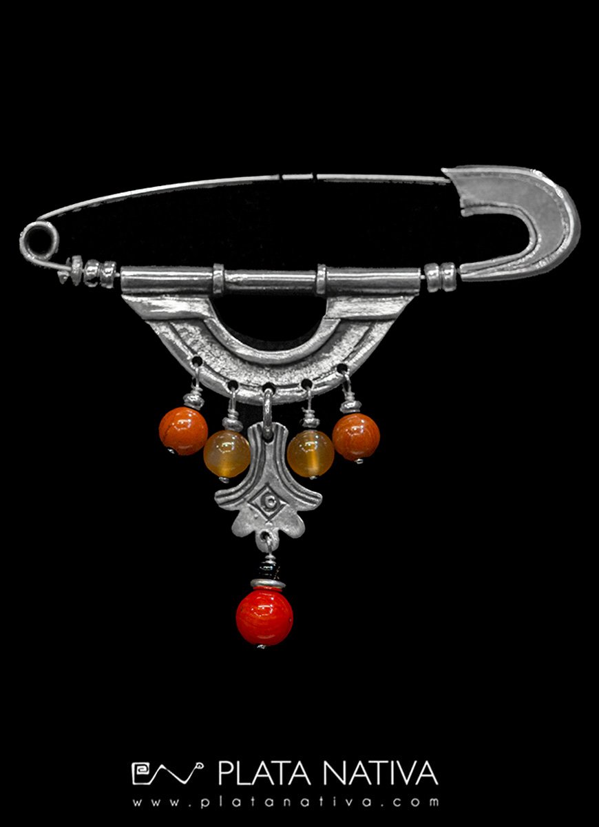 Alfiler con colgante. Ancho máximo, 7 cm. Jaspe, agata y coral bambú.