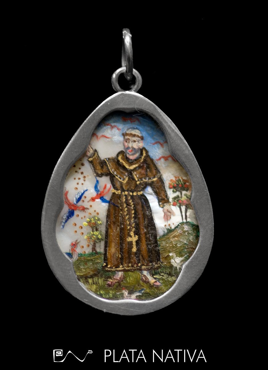 Relicario de plata 925, hecho a mano. Pintura en miniatura realizada sobre soporte de nácar. Medidas: Alto 4,5; ancho máximo 3 cm.