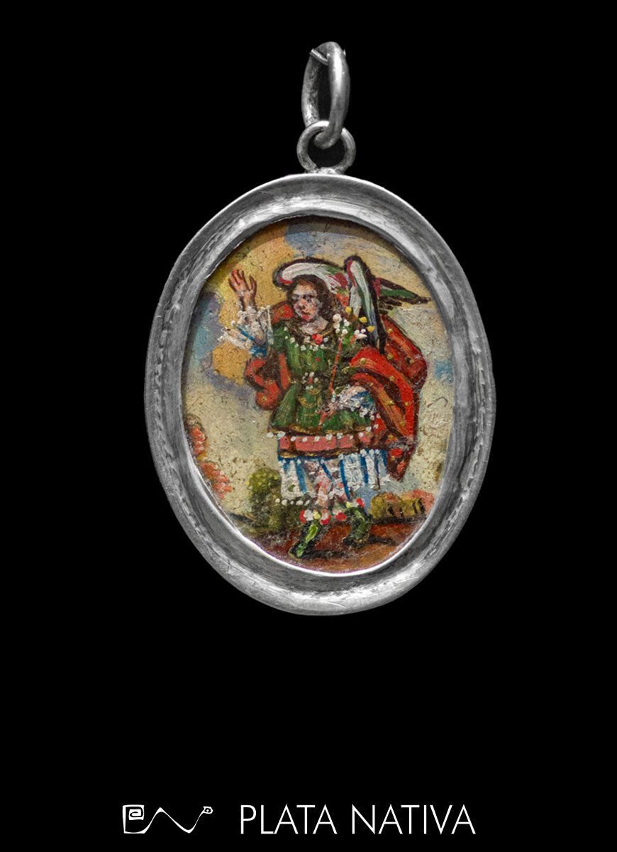Arcángel, en marco de plata 925, hecho a mano.Recuerda el estilo barroco virreinal latinoamericano. El verde en la ropa simboliza la vida, la esperanza y la curación. El rojo puede representar poder o fuego divino.La postura con la mano levantada gesto de bendición o autoridad, común en figuras como San Miguel O San Raafael