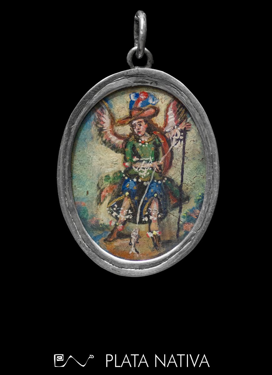 El pez es el atributo más característico del Arángel San Rafael, quien según el Libro de Tobías acompañó al jóven Tobías en su viaje y uso un pez para curar la ceguera de su padre.El bastón y el sombrero de viajero refuerzan esta identidad.