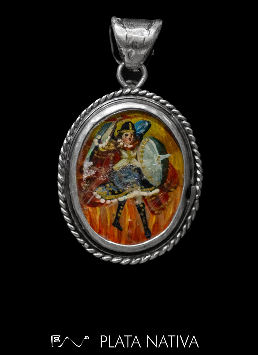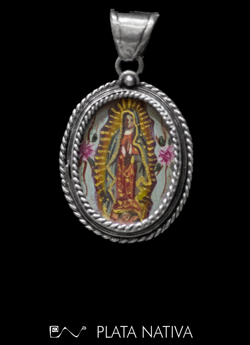 Engarzado en plata 925, la pintura en miniatura de la imágen de la Virgen de Guadalupe, y en el reverso el Arcángel San Miguel jefe de las milicias Celestiales.