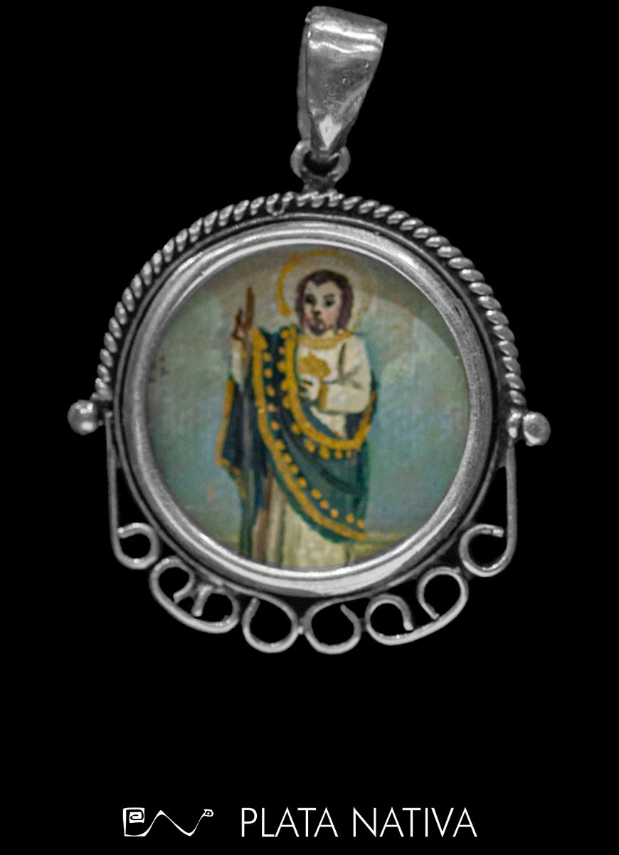 Túnica blanca y manto verde,Libro o carta representando su Epístola del Nuevo Testamento, Bastón o maza corta, símbolo de su martirio.