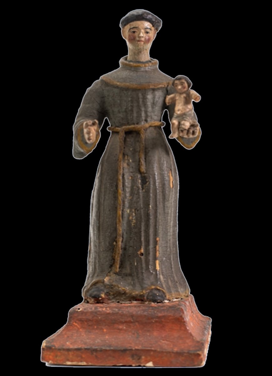 Córdoba. Argentina S.XIX 20 x 11 cm Madera y pasta.Imagen de talla completa.Ojos pintados. Policromía originaria San Antonio sostiene un niño apoyado sobre una sección cuadrada.