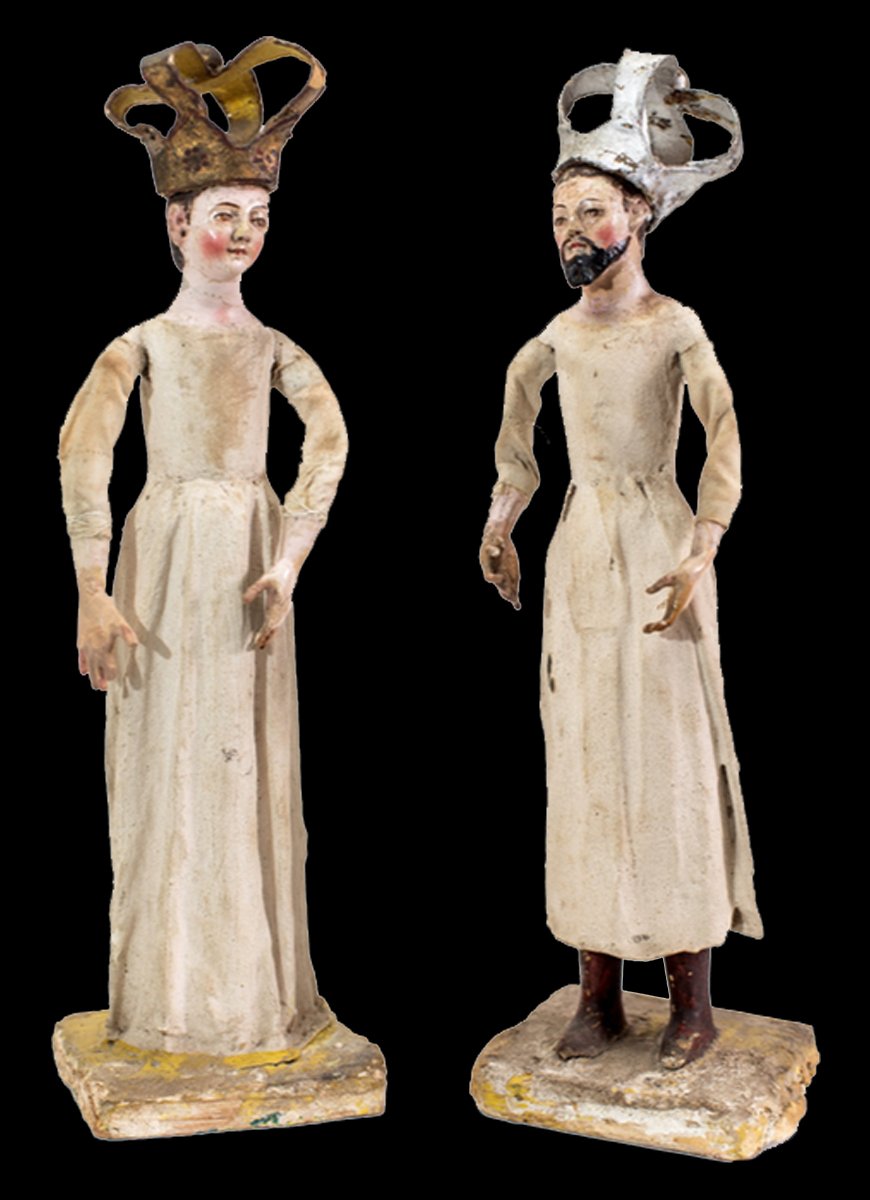 San José y la Virgen.Imagen de vestir Bolivia Siglo XIX 31x10x9 cm Magüey, tela encolada y pasta. Corona de maché. Policromía original