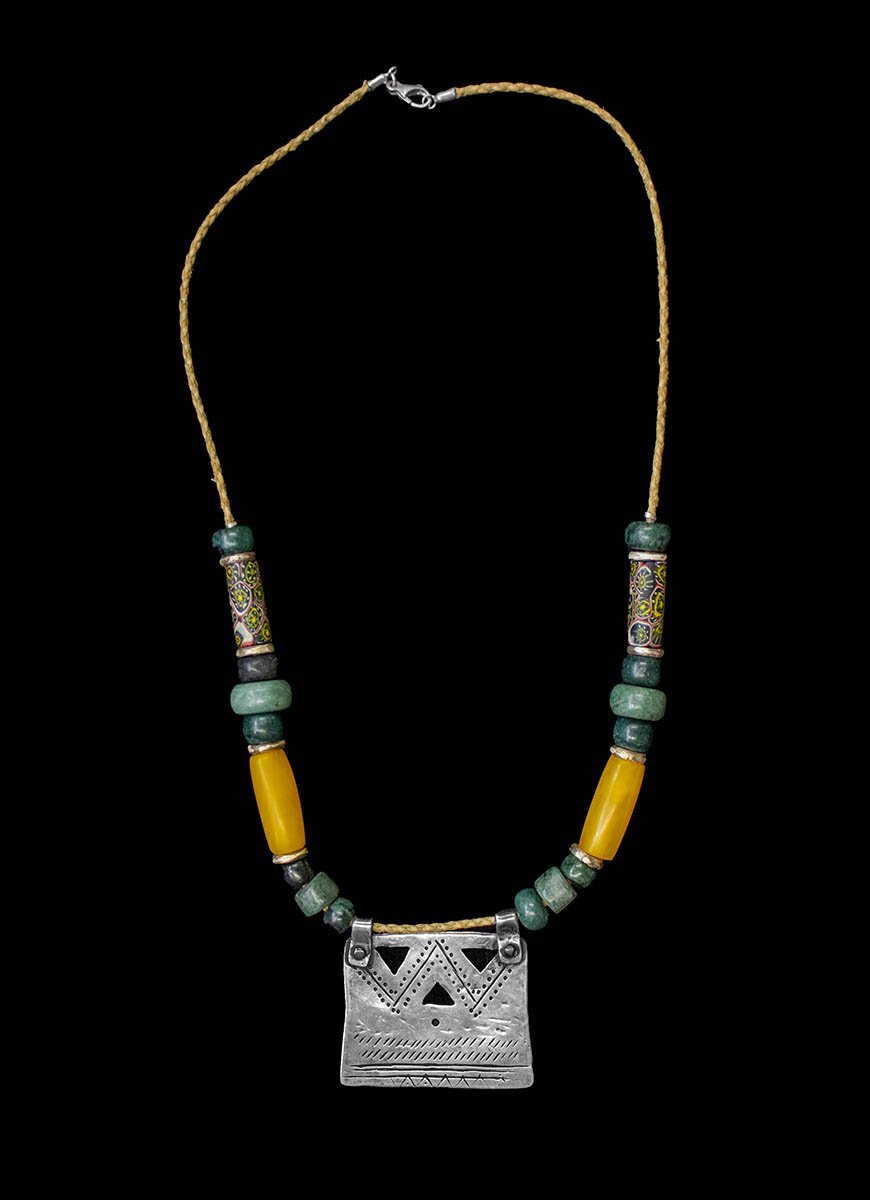 Collar con centro de plata 925, repujado y cincelado a mano.Intercalan cuentas de ambar y serpentina, sobre un cordón de cuero trenzado.Cierre de plata.