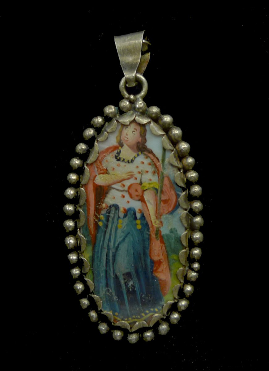 Pintura en miniatura representando a Santa Catalina. Enmarcado en plata 925. hecho a mano. medidas 4 x 2,3 cm