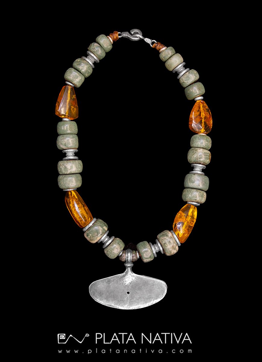Collar con ámbar, serpentina, cuentas y centro de plata 925.