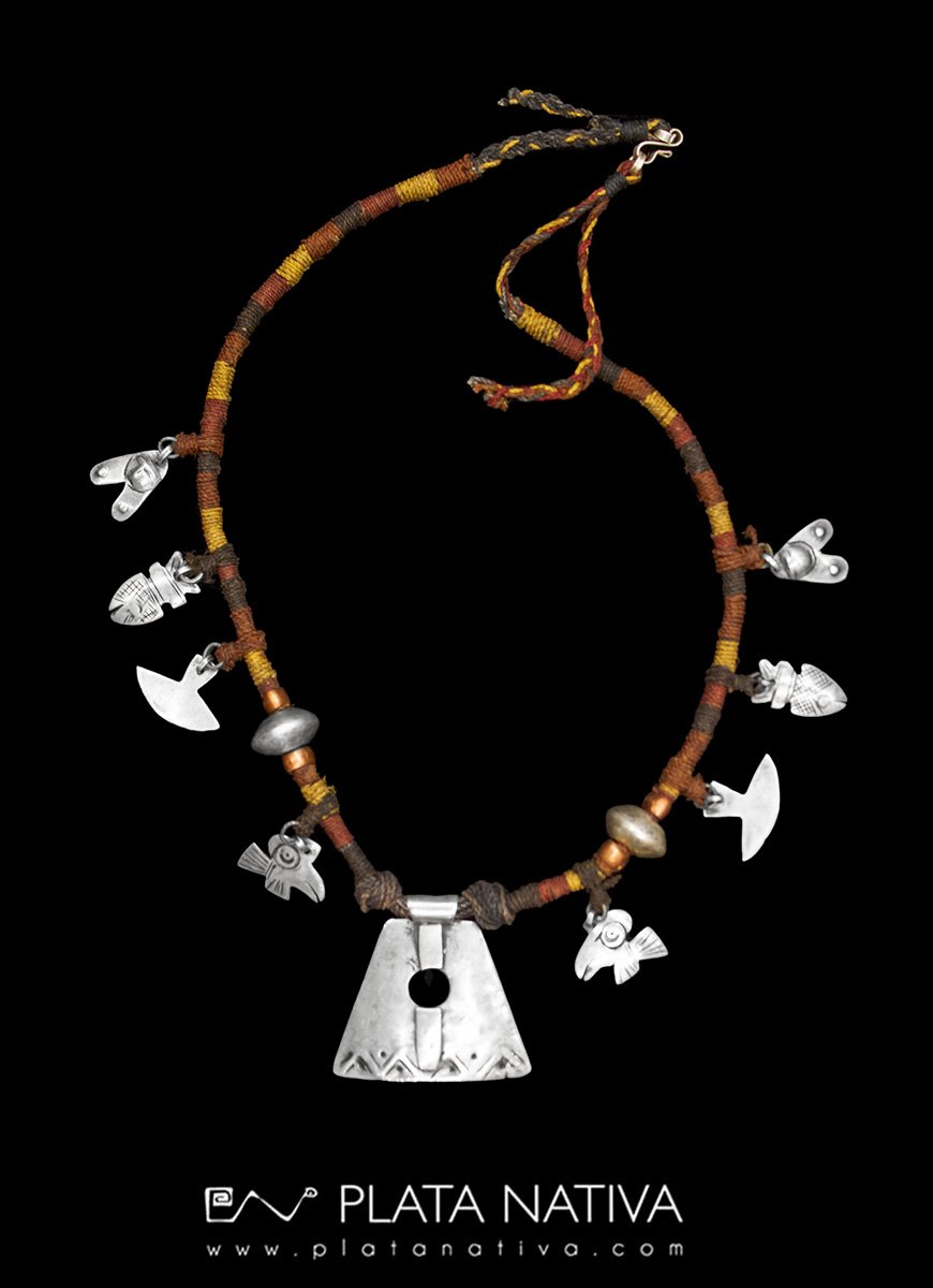 Collar con textil y piezas de plata 924, repujadas y cinceladas a mano. Pieza única