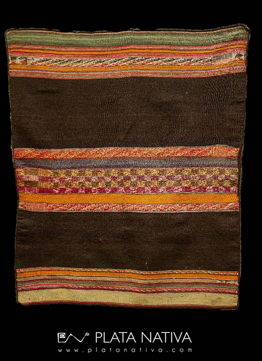 AWAYO, tejido de fibras naturales, algodón y camélido, elaborado en telar con técnica de urdiembre y trama bien definida. Los bordes superior e inferior con varias líneas delgadas paralelas en colores cálidos y fríos alternados.Una franja central más anchea con mtivos geométricos repetitivos. Medidas aproximdas, 1 m2.